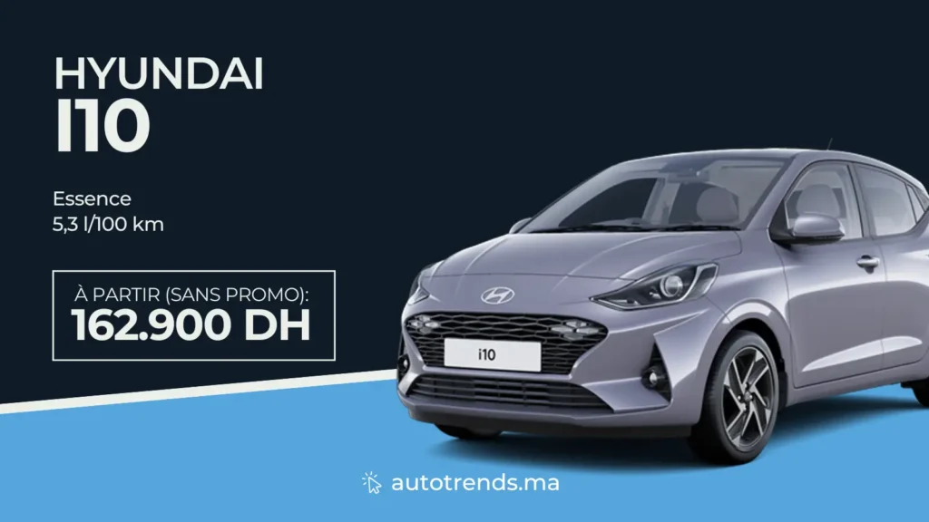 Par ailleurs, la Hyundai i10 propose une alternative essence intéressante pour la ville. Son moteur 1.0 MPI de 67 ch affiche une consommation maîtrisée de 5,3 l/100 km. Proposée à partir de 162.900 DH, cette citadine compacte facilite la vie quotidienne sans alourdir le budget entretien.