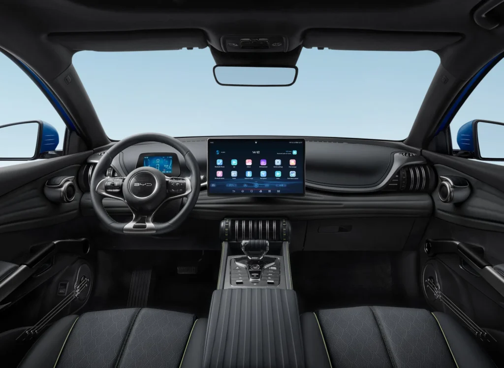 À bord de ce SUV de BYD, l’originalité est immédiatement perceptible grâce à un habitacle inspiré du monde du sport. Un écran tactile rotatif de 12,8 pouces centralise toutes les fonctions multimédias. Par ailleurs, le système audio à 8 haut-parleurs offre une immersion sonore de haute qualité. La sellerie en cuir vegan garantit un accueil premium pour tous les passagers.