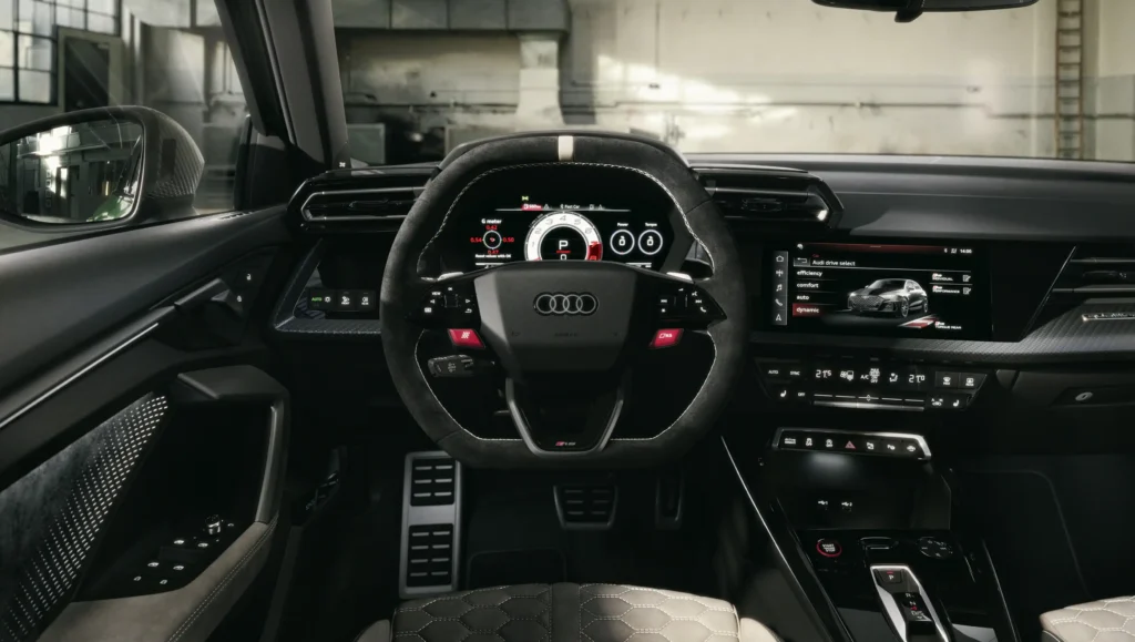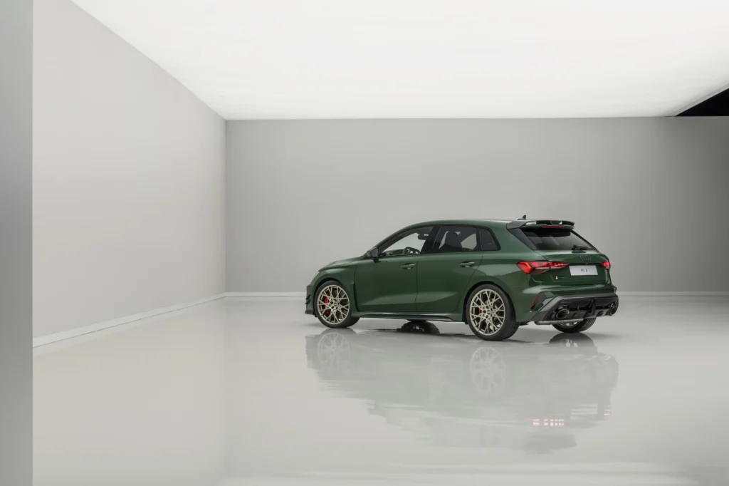 L’aspect visuel de cette compacte gagne en agressivité avec l’ajout de nombreux éléments aérodynamiques en carbone mat. Aussi, des jantes exclusives de 19 pouces en or néodyme renforcent l’élégance de la silhouette sportive. Audi propose trois coloris extérieurs, dont le vert Malachite qui rappelle l’époque glorieuse du rallye. Par ailleurs, les projecteurs Matrix LED affichent une animation spécifique liée à l’ordre d’allumage des cylindres du moteur turbo. Concrètement, chaque détail extérieur souligne le caractère radical et prestigieux de cette édition limitée.