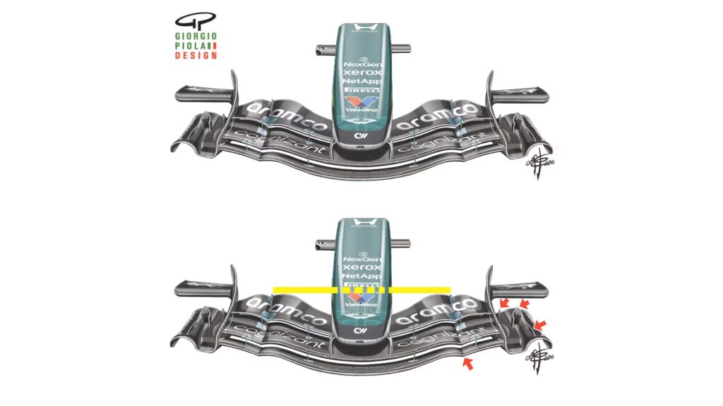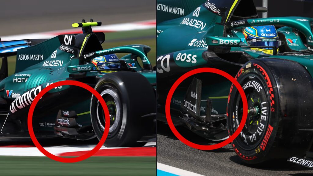 Ensuite, le fond plat de l’Aston Martin a subi des retouches notables pour s’accorder avec ce nouveau flux. De plus, deux petites ailettes internes optimisent désormais l’évacuation de l’air sur les côtés. En revanche, le règlement de la FIA impose normalement une redirection de l’air vers l’intérieur pour faciliter les dépassements. Néanmoins, les ingénieurs de Silverstone tentent de contourner cette contrainte légale pour obtenir un air plus propre sous la voiture. Finalement, la qualité du flux alimentant le début du plancher reste la priorité absolue pour gagner en stabilité dans les virages rapides.